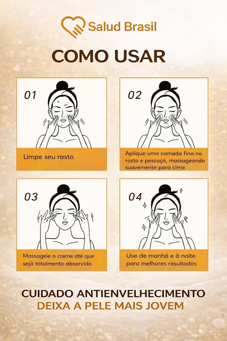 Ação Dupla (Rosto e Pescoço): Formulado especificamente para tratar a pele do rosto e a região esquecida do pescoço/colo, combatendo a gravidade.