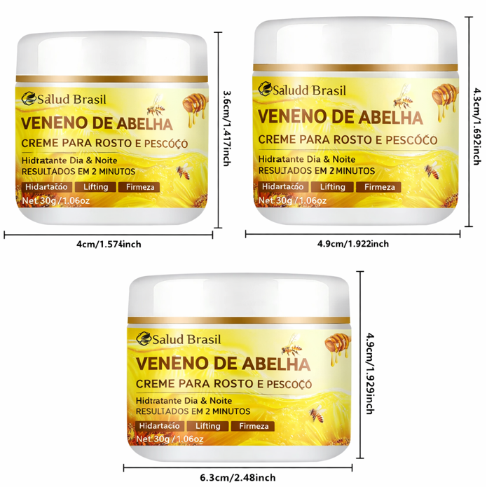P: Qual a diferença para o creme de Cobra? R: O SaludVenom (Cobra) é focado em relaxar rugas de expressão (testa/olhos). O SaludBee (Abelha) é focado em estimular colágeno e firmar a flacidez global (bochechas/pescoço).