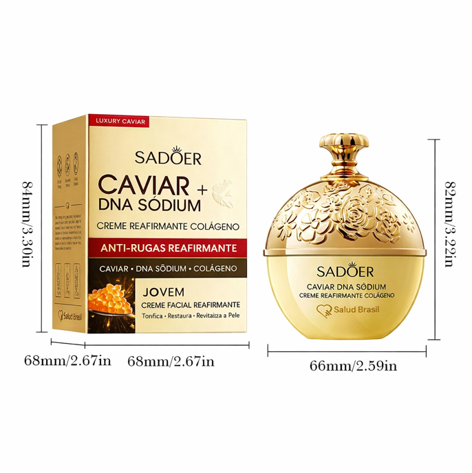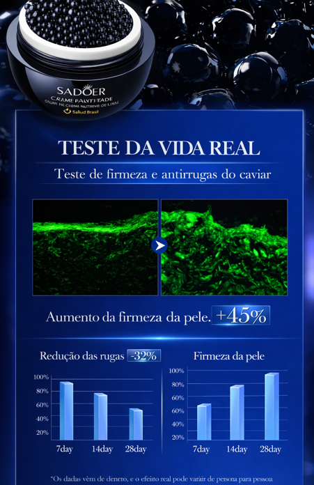 P: Qual a diferença para o creme de Veneno de Abelha? R: O SaludBee (Abelha) é focado em lifting e firmeza (esticar a pele). O SaludCaviar (este) é focado em nutrição profunda e regeneração (dar vida e brilho à pele seca/madura).