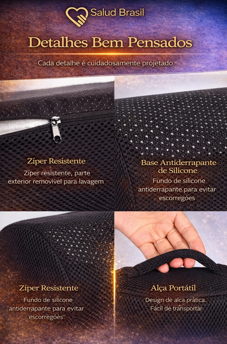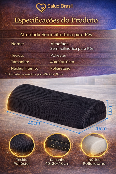 P: Ele escorrega no chão? R: Não. A capa do SaludPosture Foot possui uma textura inferior projetada para criar atrito, mantendo o apoio estável em pisos de madeira, frios ou carpetes.
