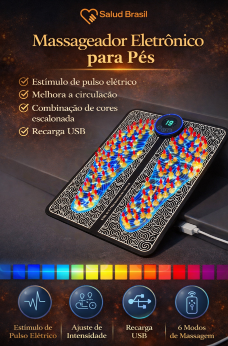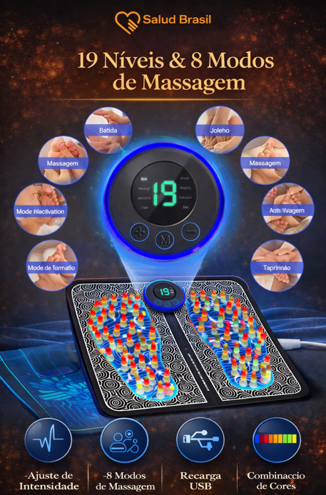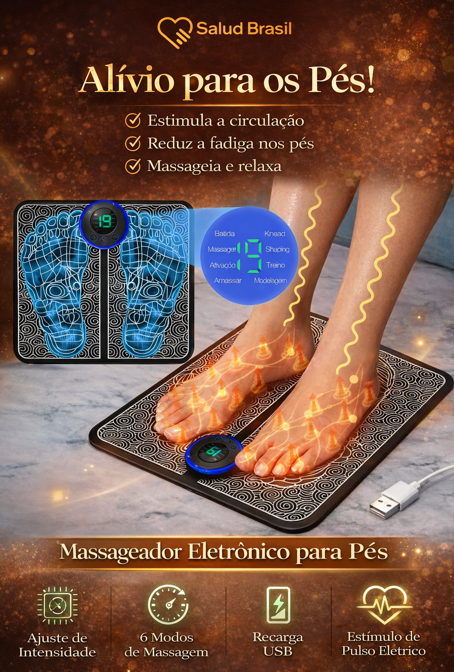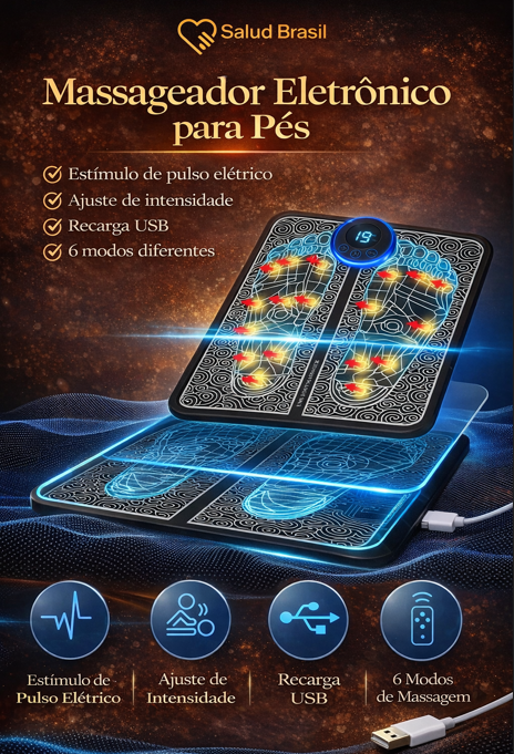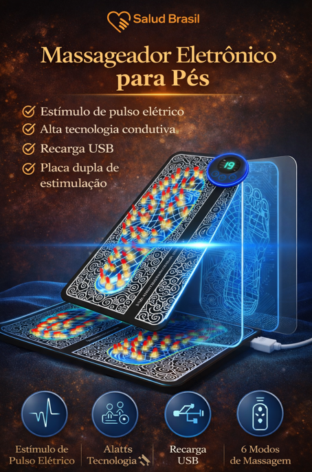 A SaludBrasil apresenta o SaludPulse Foot, um spa tecnológico para seus pés. Através de microcorrentes elétricas suaves, ele estimula diretamente os pontos de acupuntura na sola dos pés, provocando contrações musculares que bombeiam o sangue de volta para o coração, reduzindo o inchaço e a fadiga instantaneamente.