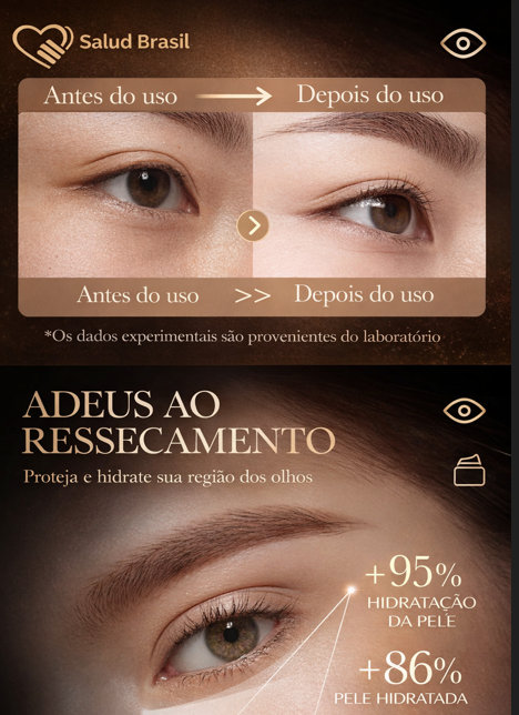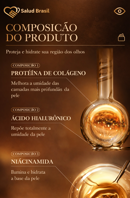 Adeus Olheiras e Bolsas: Possui ingredientes que estimulam a microcirculação, drenando o inchaço (bolsas) e clareando as manchas escuras abaixo dos olhos.